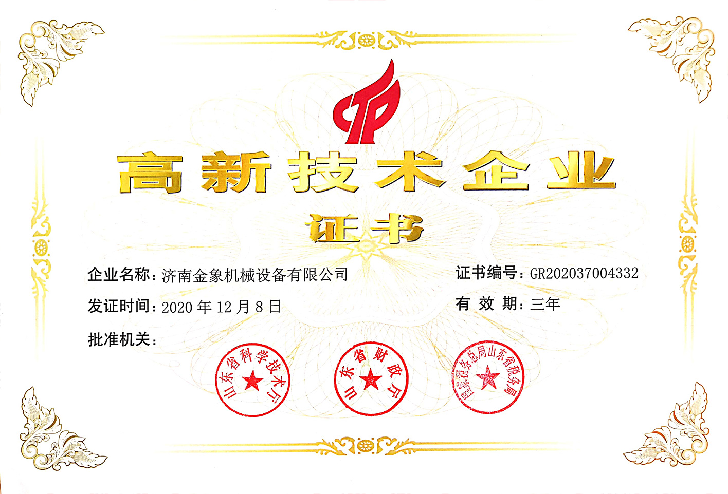 根據(jù)國家《高新技術(shù)企業(yè)認(rèn)定管理辦法》和《高新技術(shù)企業(yè)認(rèn)定管理工作指引》的相關(guān)規(guī)定,濟(jì)南金象機(jī)械設(shè)備有限公司被認(rèn)定為國家級(jí)高新技術(shù)企業(yè)。